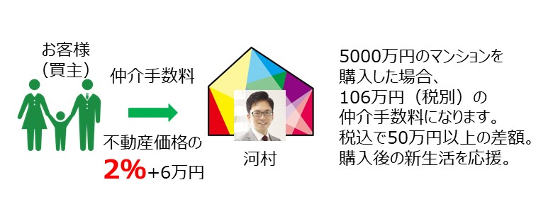 徹底的に固定費を削減しているため、必要以上にお客様から仲介手数料を頂かなくても、十分に運営できます。5000万円の物件を買った場合、大手仲介業者と比べて、50万円以上の手数料の節約になります。浮いたお金で、新しい家具や家電の購入に、新居購入祝いの旅行に、新生活がより充実することを応援します。
